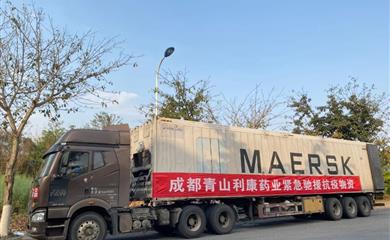 3月21日晚,一輛懸掛著“成都青山利康藥業(yè)緊急馳援抗疫物資”的物流車(chē)駛?cè)爰珠L(zhǎng)春。